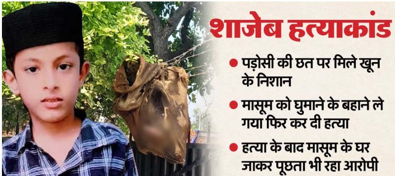 मासूम शाजेब की मां जैस्मिन ने बताया कि आरोपी शैलेन्द्र निगम उर्फ मंटू उनके पुत्र को घुमाने लेकर गया था। इसके बाद उसे झुला झुलाया। इसके बाद से शाजेब लापता हो गया। शाजेब की मां ने बताया कि मंटू बार-बार उसके घर आकर पूछ रहा था कि शाजेब मिला या नहीं।