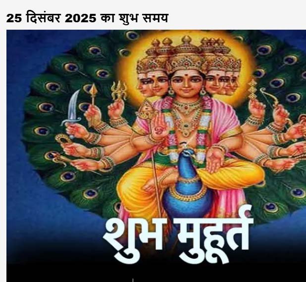 25 दिसंबर 2025 को पौष माह के शुक्ल पक्ष की पंचमी तिथि है। इस तिथि पर धनिष्ठा नक्षत्र और वज्र योग का संयोग बन रहा है। दिन के शुभ मुहूर्त की बात करें तो गुरुवार को अभिजीत मुहूर्त 12:00 − 12:41 मिनट तक रहेगा। स्कन्द षष्ठी के व्रत का खास महत्व है, जो मुख्यतौर पर माता पार्वती और शिव जी के पुत्र भगवान कार्तिकेय को समर्पित है. धार्मिक मान्यता के अनुसार, सफलतापूर्वक स्कन्द षष्ठी का व्रत रखने से घर-परिवार में खुशियों का वास होता है. साथ ही संतान की लंबी आयु और खुशहाल जीवन का आशीर्वाद मिलता है. सूर्योदय: सुबह 07 बजकर 12 मिनट पर