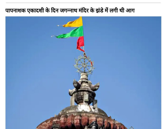 पापनाशक एकादशी के दिन जगन्नाथ पुरी मंदिर में एक अखंड महादीप जलाया गया था लेकिन अचानक तेज हवा चली और झंडा उड़कर दीपक के चला गया गया, जिससे मंदिर के झंडे में आग लग गई। यह घटना 19 मार्च 2020 को हुई थी। झंडे में आग लगने का उल्लेख भी भविष्य मालिका में मिलता है। इस घटना के बाद यह कहा जाने लगा कि यह कलियुग के अंत का संकेत है और दुनिया का महाविनाश भी होने ही वाला है।