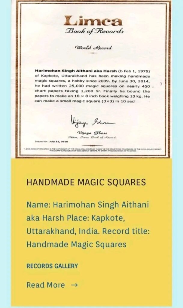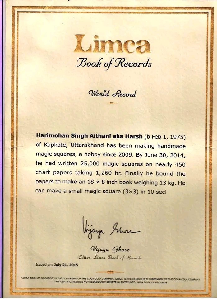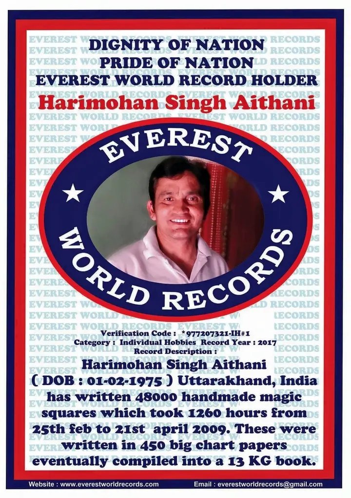 आदि कई रिकॉर्ड और अवार्ड हैं। अब तक इनको विभिन्न संस्थाओं से 40+ वर्ल्ड रिकॉर्ड और अवार्ड प्राप्त हो चुके हैं , इनको ये प्रमाणपत्र 13 किलोग्राम भार वाली मैजिक स्क्वायर बुक को बिना किसी गणना यंत्र के सहारे में लिखने ,पुराने और नए नए गणितीय सिद्धांतों को कम से कम समय में सत्यापित करने में मिले हैं। हाल ही में उन्होंने मात्र 15 दिनों में एक अंतर्राष्ट्रीय जटिल गणित की थ्योरी का हल दिया था, जिनके अब तक इनके 2 अंतराष्ट्रीय ओपन रिव्यू जर्नल प्रकाशित हो चुके हैं, यह गणित की थ्योरी दुनिया के टॉप 10 थ्योरी के अंदर आता है। इनकी उपलब्धियों को देखते हुए उत्तराखंड के सामान्य ज्ञान और करेंट अफेयर्स में भी कई ब्लॉगर ने इनका नाम अंकित कर दिया है तथा प्रतियोगी परीक्षा में भी इनकी उपलब्धियों को पूछा जा चुका है।