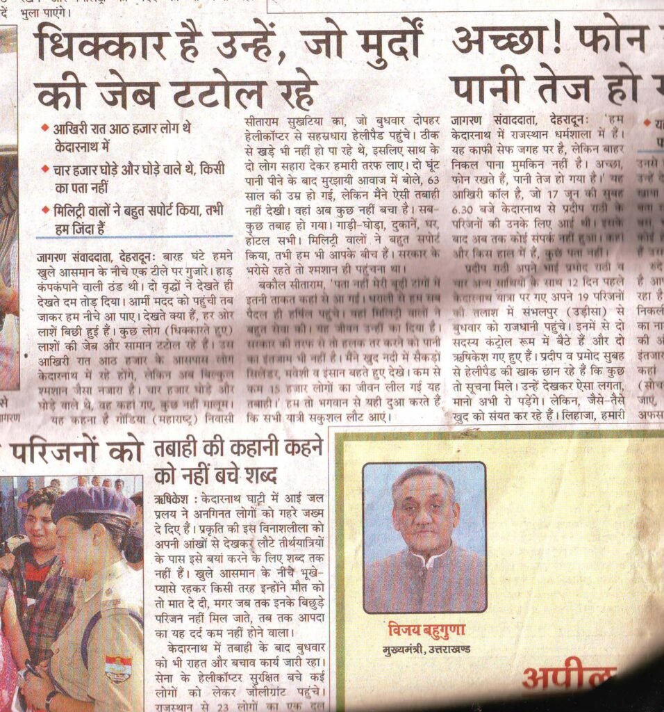 भारत सरकार व राज्य सरकार ने उत्तराखण्ड की आपदा को गंभीरता से नहीं लिया – लाखों जनता उत्तराखण्ड के पर्वतीय क्षेत्रों में फंसी है, कोई विशेष आपरेशन शुरू करने के बारे में सोचा तक नहीं गया- गुप्तकाशी में फंसी महिला ने फोन पर बताया कि केदारनाथ क्षेत्र में 2 हजार से ज्यादा काल के गास में समाये वहीं सैकडो गाडिया नदी में समायी है-