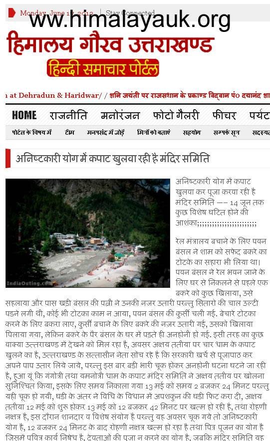 रेल मंत्रालय बचाने के लिए पवन बंसल ने शाम को सफेद बकरे का टोटके का सहारा भी लिया था। पवन बंसल ने रेल भवन जाने के लिए घर से निकलने से पहले एक बकरे को कुछ खिलाया, उसे सहलाया और पास खड़ी बंसल की पत्नी ने उनकी नजर उतारी परन्तु सितारो की चाल उल्टी पडने लगी थी, कोई भी टोटका काम न आया, पवन बंसल की कुर्सी चली गई. बेचारे टोटका करने के लिए बकरा लाए, कुर्सी बचाने के लिए बकरे की नज़र उतारी गई, उसको खिलाया पिलाया गया, लेकिन बकरे के पैर बंसल के घर में पड़ते ही अनहोनी हो गई. इसी तरह का कुछ वाक्या उत्तराखण्ड में देखने को मिल रहा है, अवसर अक्षय त़तीया पर चार धाम के कपाट खुलने का है, उत्तराखण्ड के सत्तासीन नेता सोंच रहे है कि सरकारी खर्चे से पूजापाठ कर अपने पाप उतार लिये जाये, परन्तु इस बार बडी भारी चूक होकर अनहोनी घटना घटने जा रही है, हुआ यूं कि गंगोत्री तथा यमनोत्री धाम के कपाट मंदिर समिति ने अक्षय त़तीय पर खोलना सुनिश्चित किया, इसके लिए समय निकाला गया 13 मई को समय 2 बजकर 24 मिनट परन्तु यही चूक हो गयी, घडी के अंतर ने विधि के विधान में अपशकुन की घडी फिट करा दी, अक्षय त़तीया 12 मई को शुरू होकर 13 मई को 12 बजकर 42 मिनट पर खत्म हो रही है, तथा रोहणी नक्षत्र है, इस दौरान शानदार व विशेष संयोग है परन्तु यह अवसर चूक गये तो अनिष्टकारी योग है, 12 बजकर 24 मिनट के बाद रोहणी नक्षत्र खत्म हो रहा है तथा पित़्र पूजन का योग है जिसमें पवित्र कार्य निषेध है, देवताओं की पूजा न करने का योग है, जबकि मंदिर समिति यह अनिष्टकारी योग में कपाट खुलवा कर पूजा करवा रही है, इसका क्या असर व परिणाम होगा, यह तो ज्योतिषाचार्य गणना कर बाद में बताएंगे परन्तु गंगोत्री व यमुनोत्री के कपाट गलत मुहूर्त में खोले जाने का मुहूर्त पहली बार हो रहा है, इसके लिएजाने क्या अनिष्टकारी योग छिपा है, ज्ञात हो कि मेरे द्वारा निम्न लाइन दो दिन पूर्व फेसबुक में प्रकाशित की थी, आपके संज्ञान के लिए पुन- प्रकाशित कर रहा हूं,